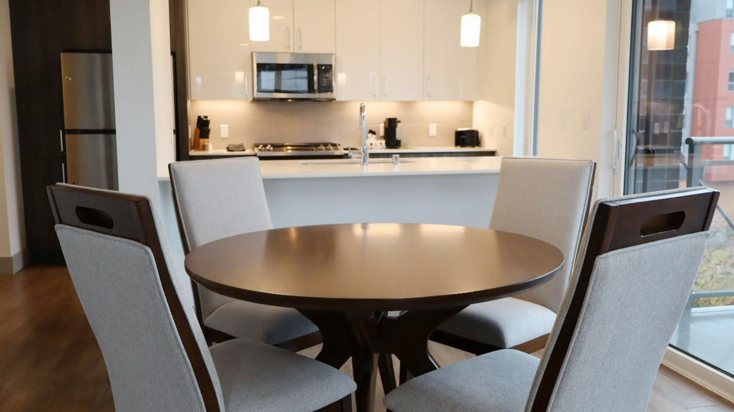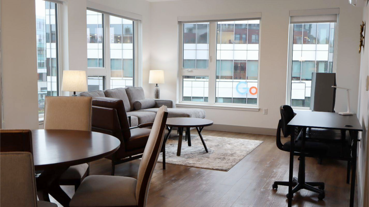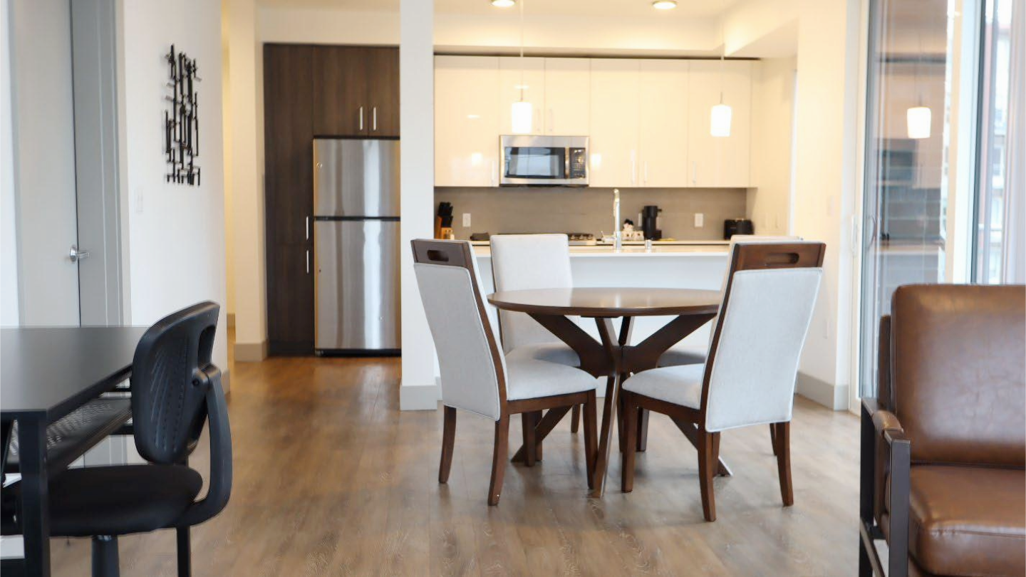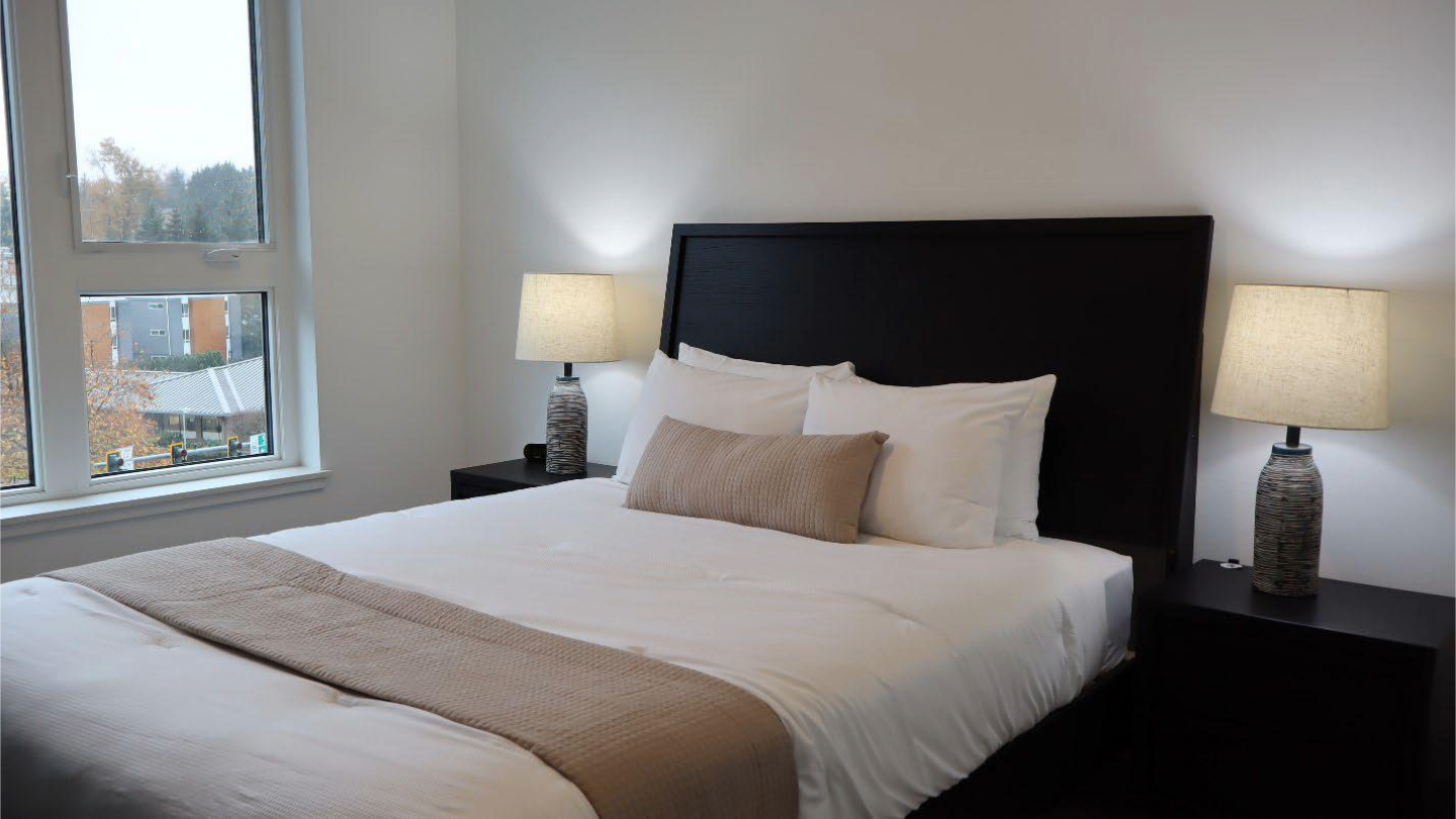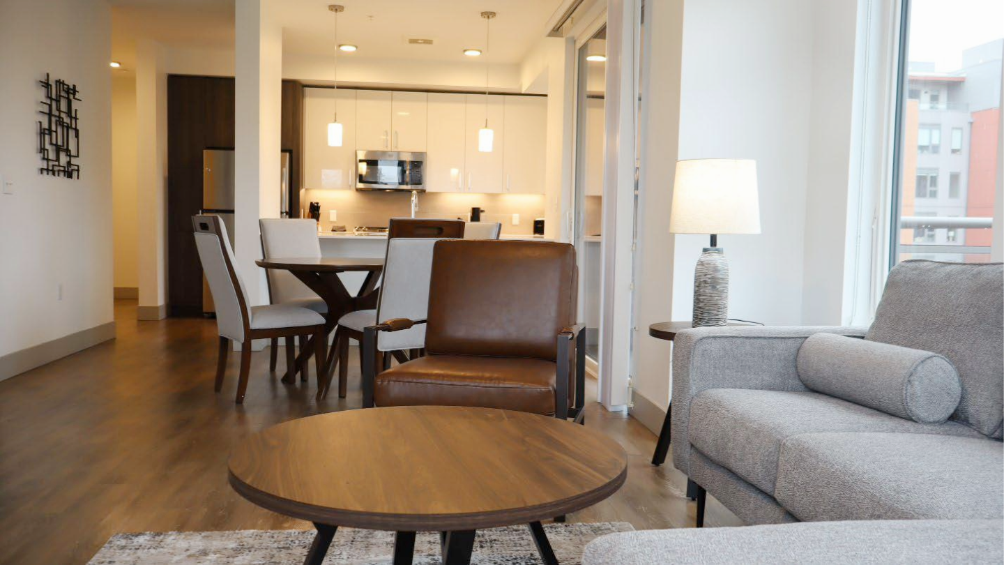 Uptown 420 delivers modern design with elegant touches throughout. This 2-bed, 2-bath apartment features a gourmet kitchen, full-sized in-unit laundry, air conditioning, and expansive windows that highlight views of Lake Washington. With over 1,000 square feet of space, it’s ideal for small families, traveling professionals, or colleagues sharing a temporary home.